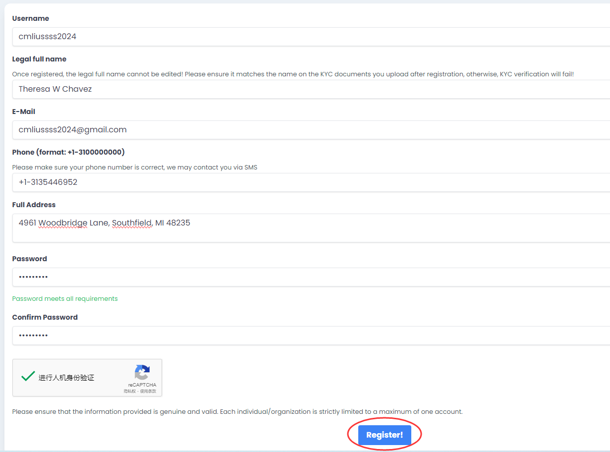 1. 打开register.us.kg后,按照上一步生成的身份信息一一填入后,点击Register!;