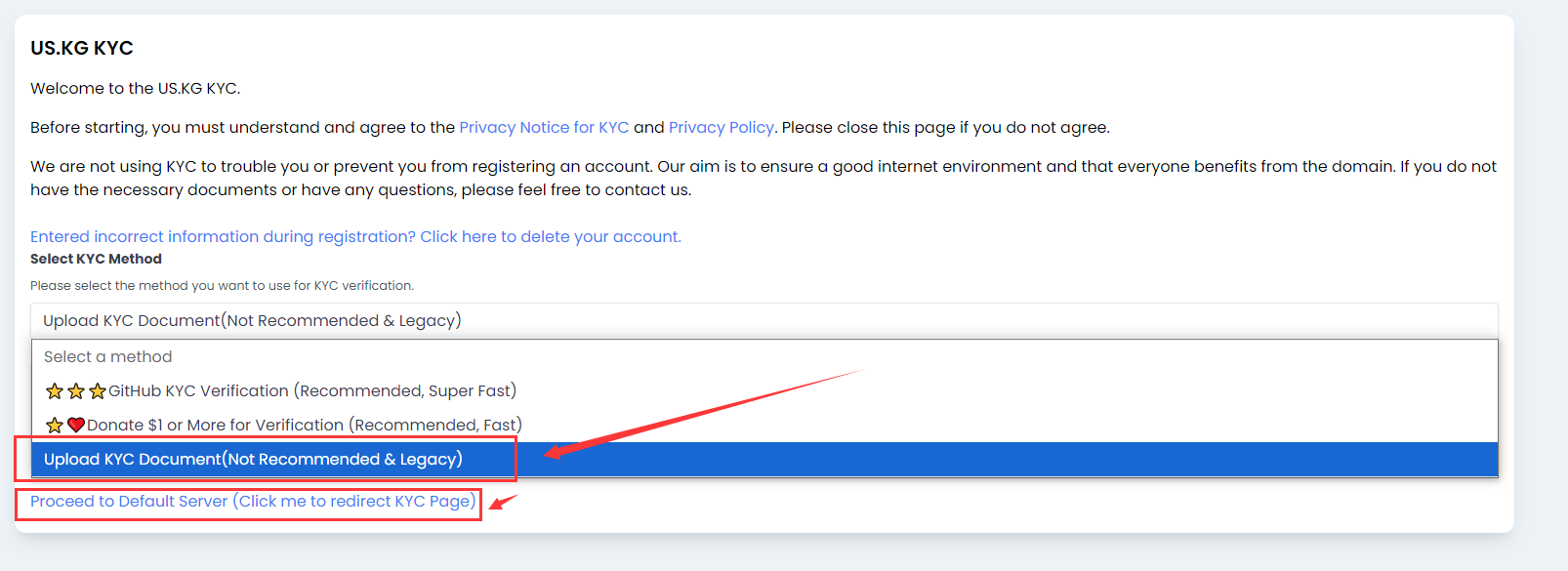 ### 2. 选择**KYC方式:Upload KYC Document(Not Recommended & Legacy)**;