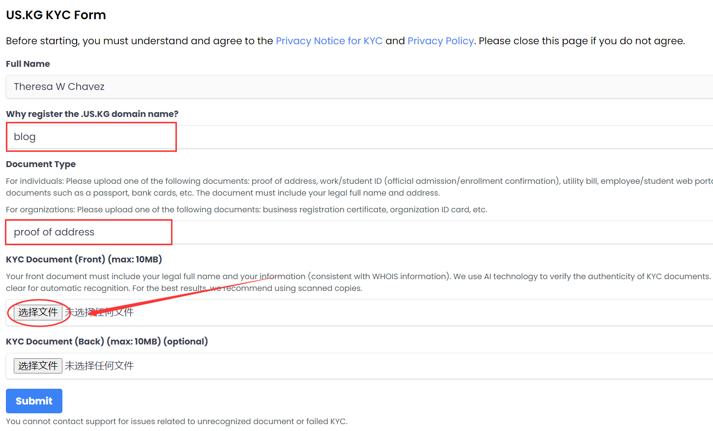 - KYC Document:选择第一步保存的kyc.png文件;
