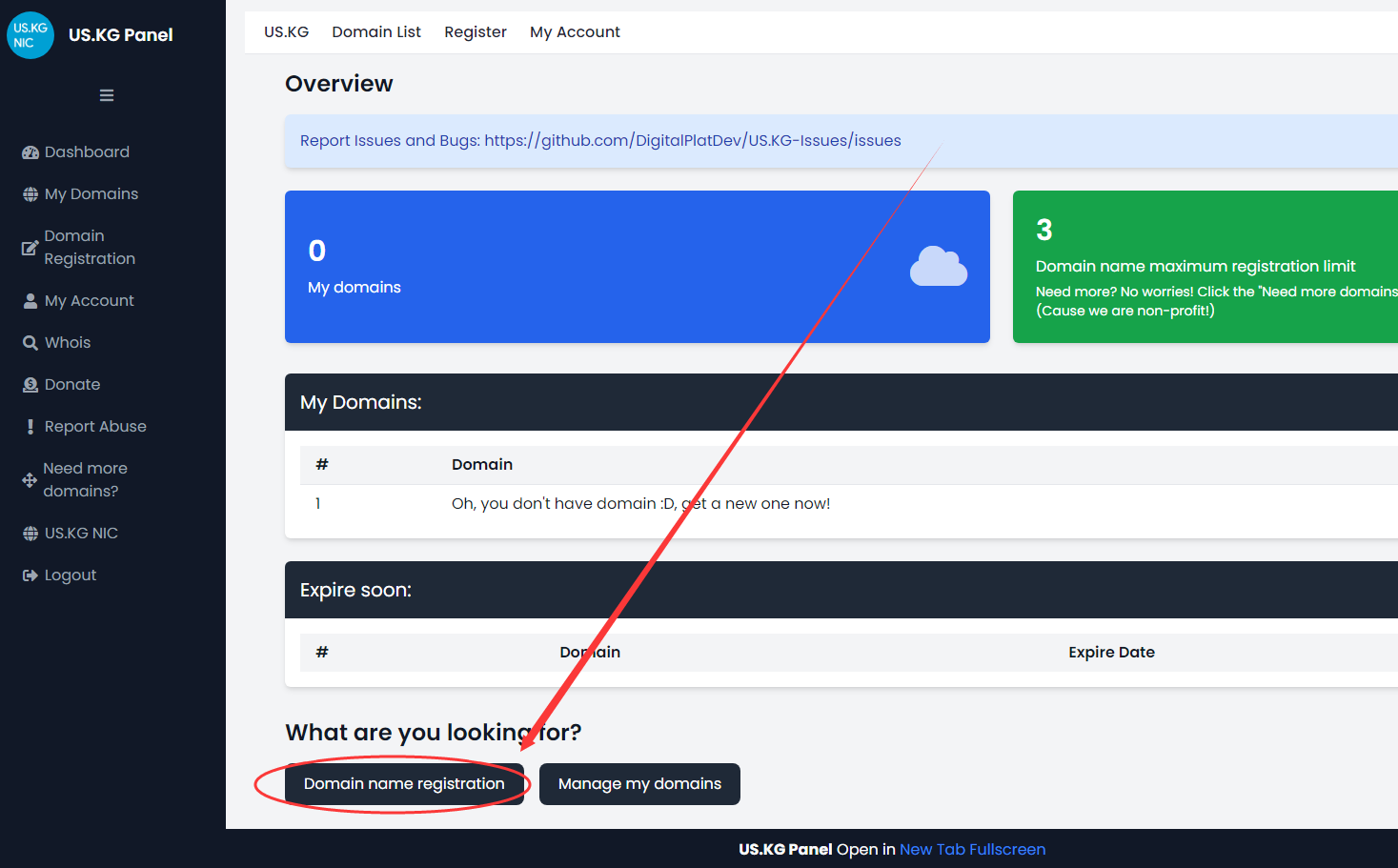 1.点击Domain name registration申请你的us.kg域名;