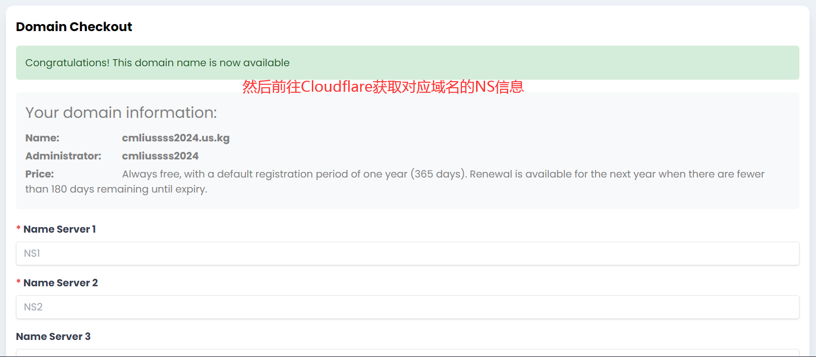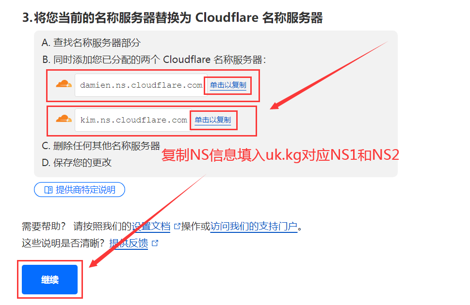 7.复制Cloudflare提供的NS信息填入us.kg对应Name Server 1&Name Server 2