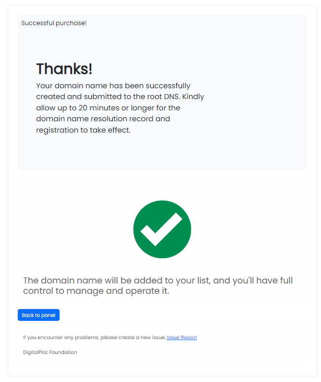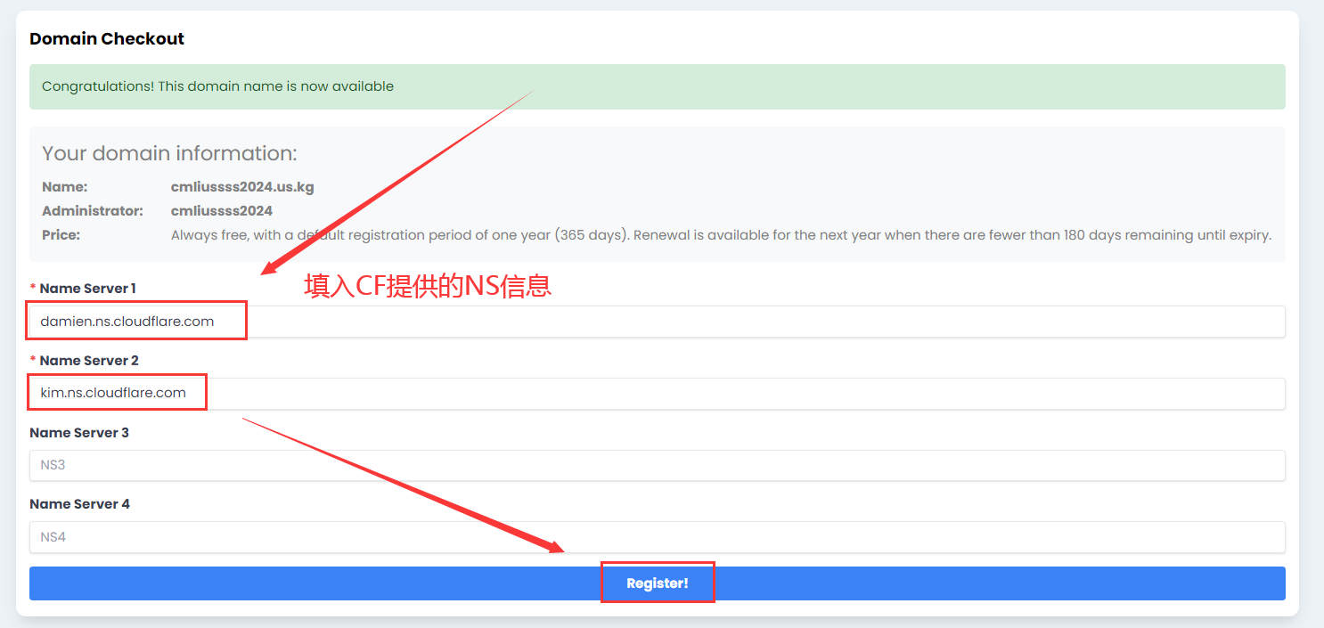 8.点击 继续 & Register! 后等待域名生效;